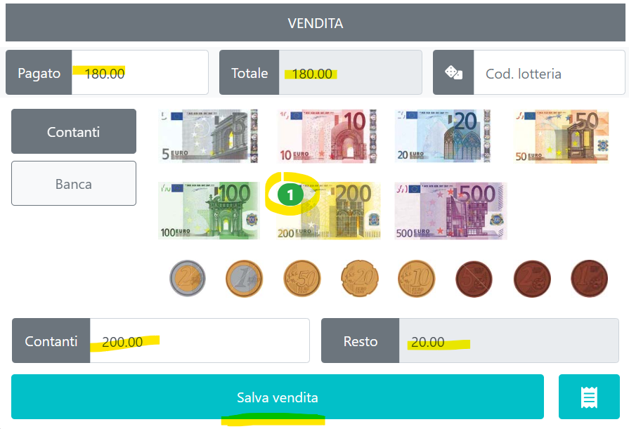 Se sceglie contanti verrà mostrata la schermata in cui inserire le banconote ricevute per ottenere il calcolo del resto (immagine di seguito).
